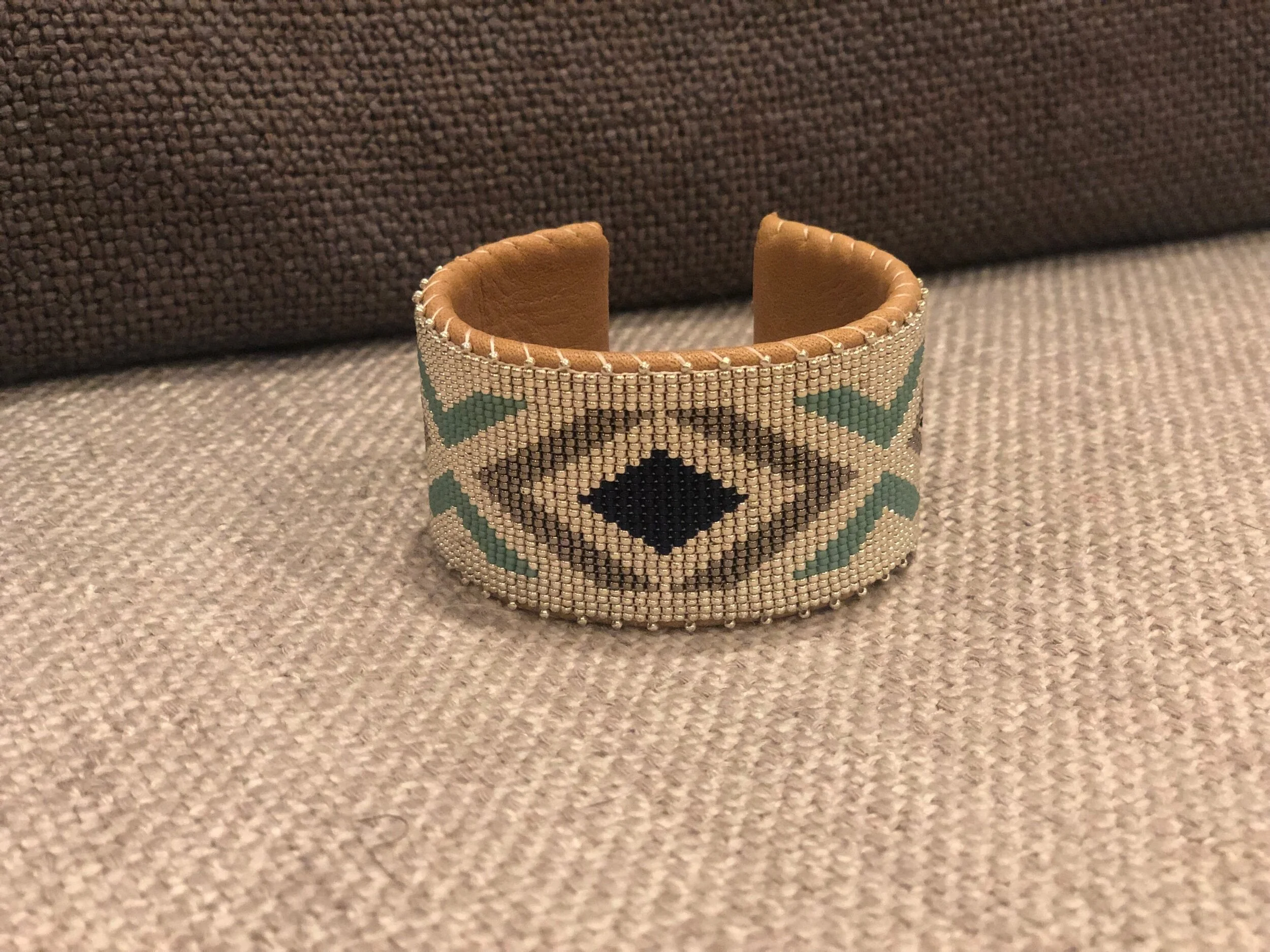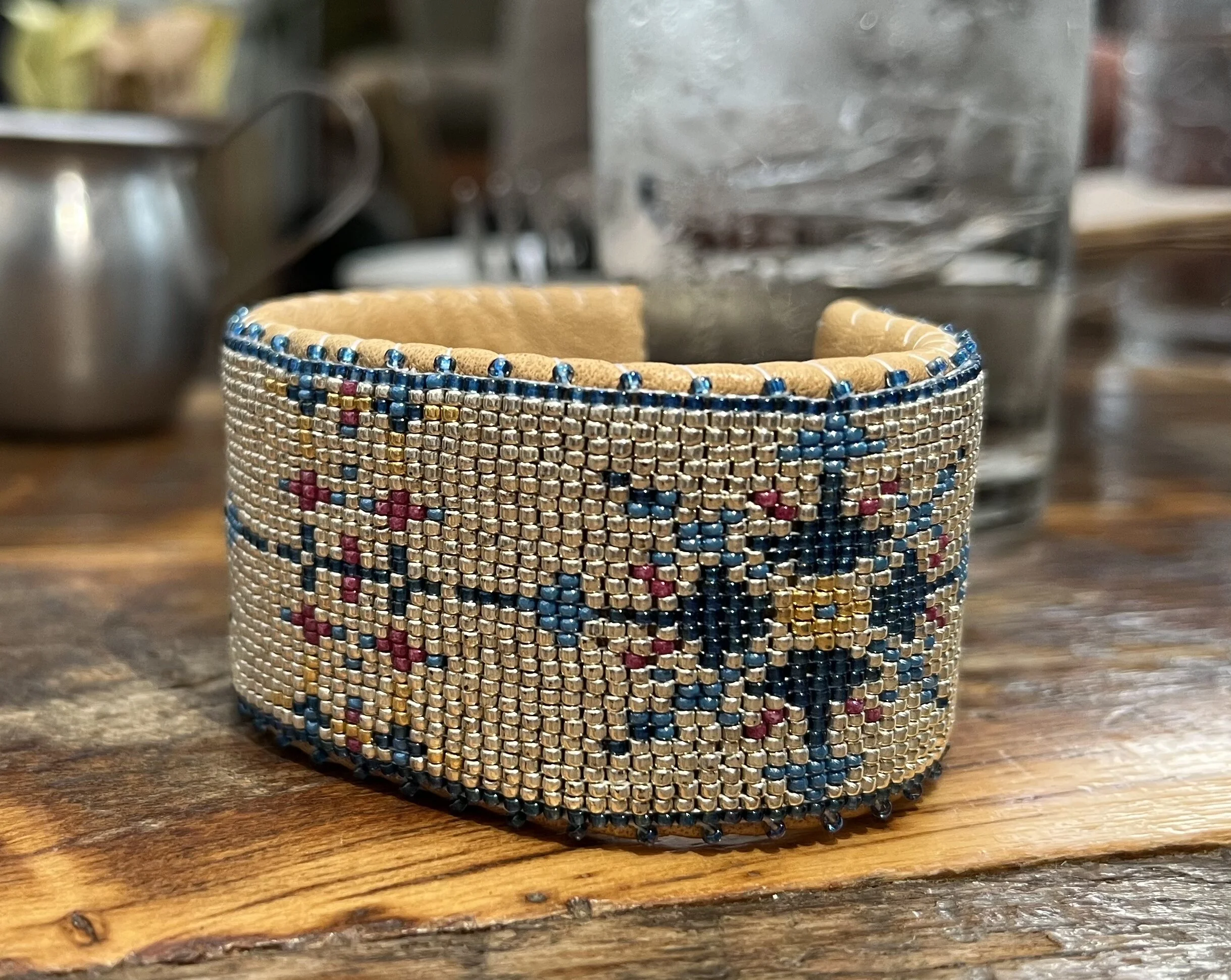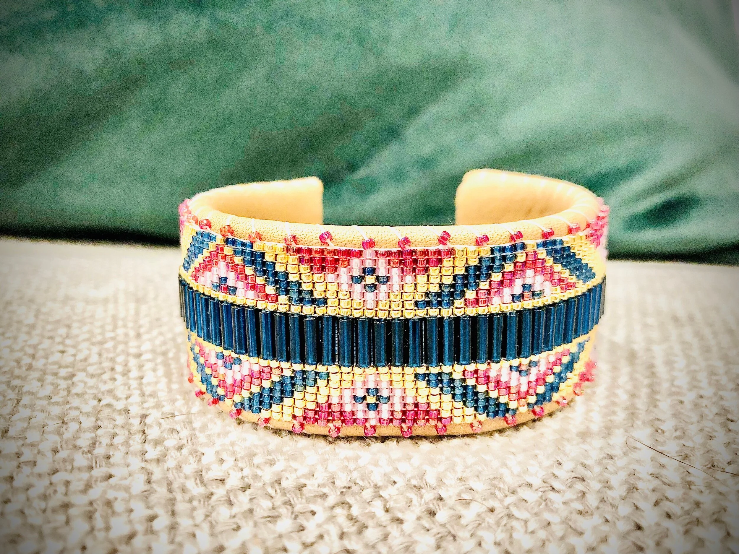 Leather cuffs are Hand-Crafted from high-quality glass and metal beads, stitched onto genuine leather, with a solid copper inlay that provides structure and adjustability. Available in very limited quantities.