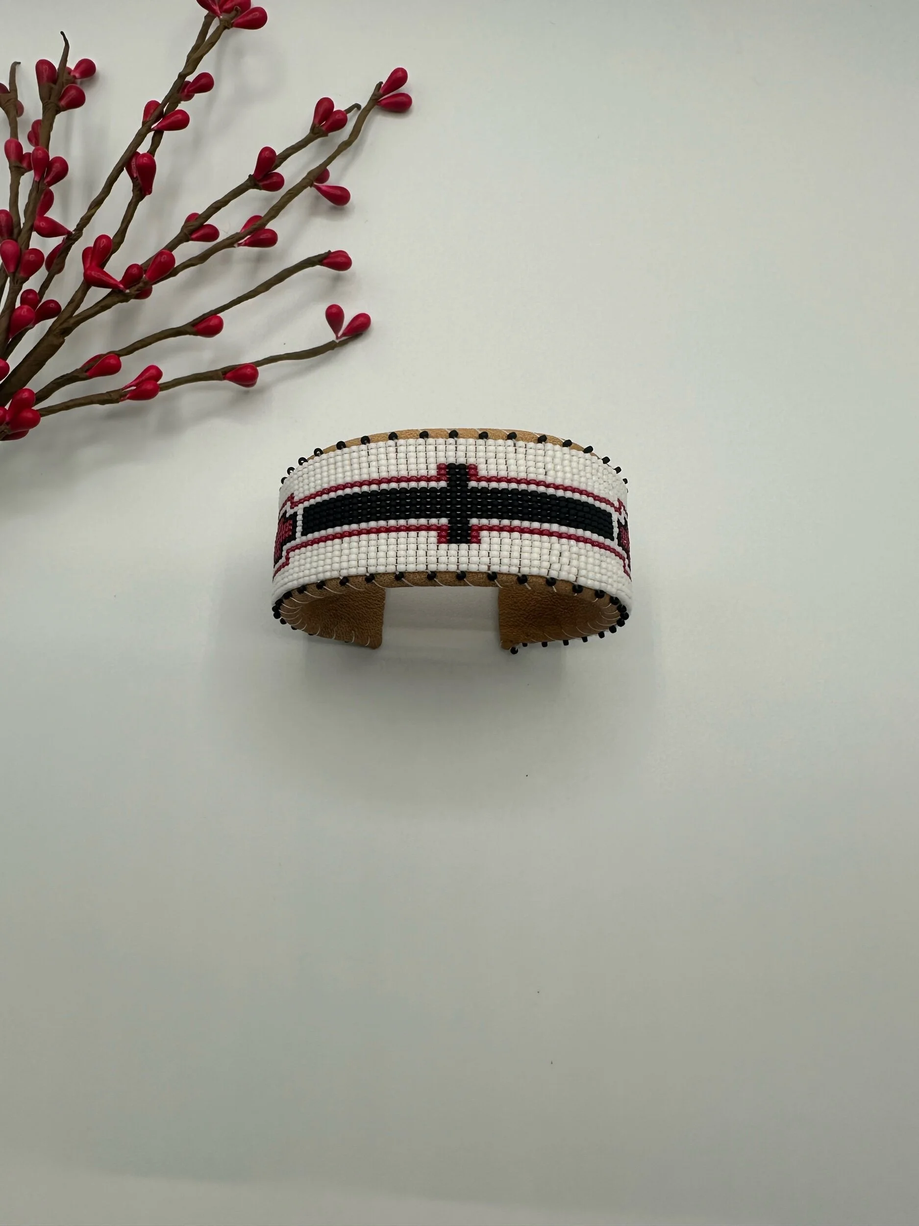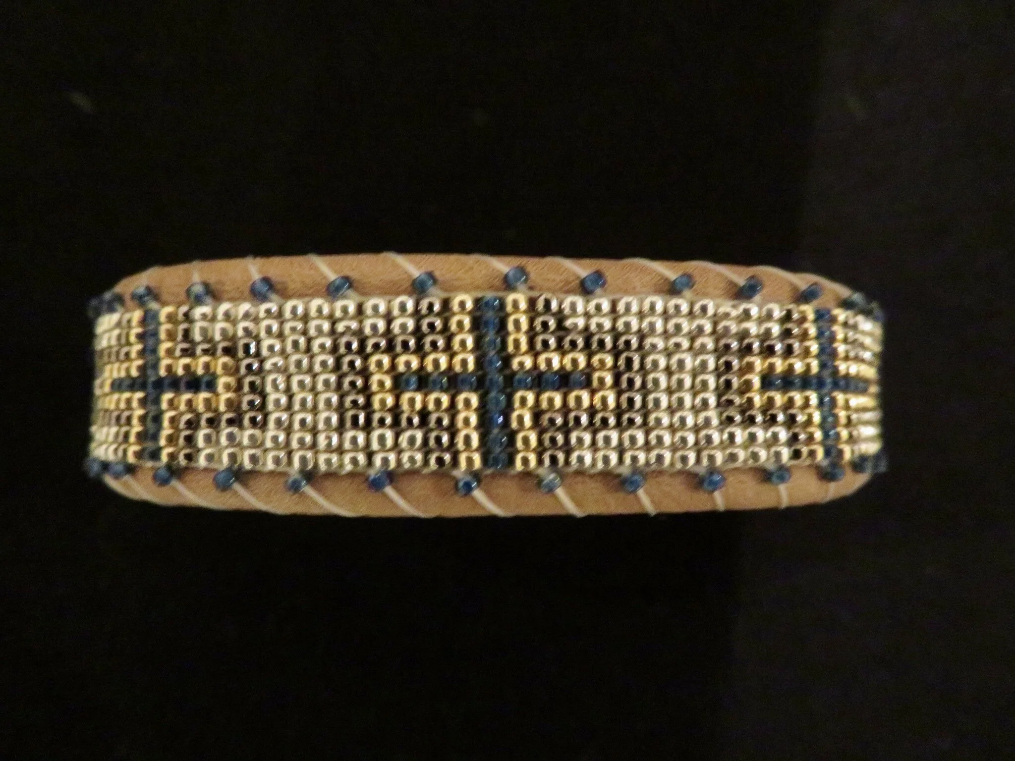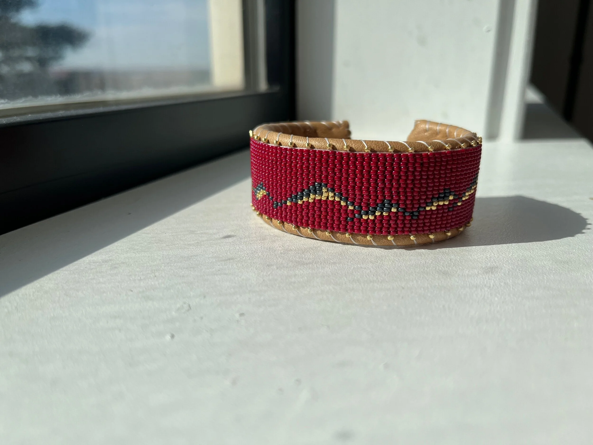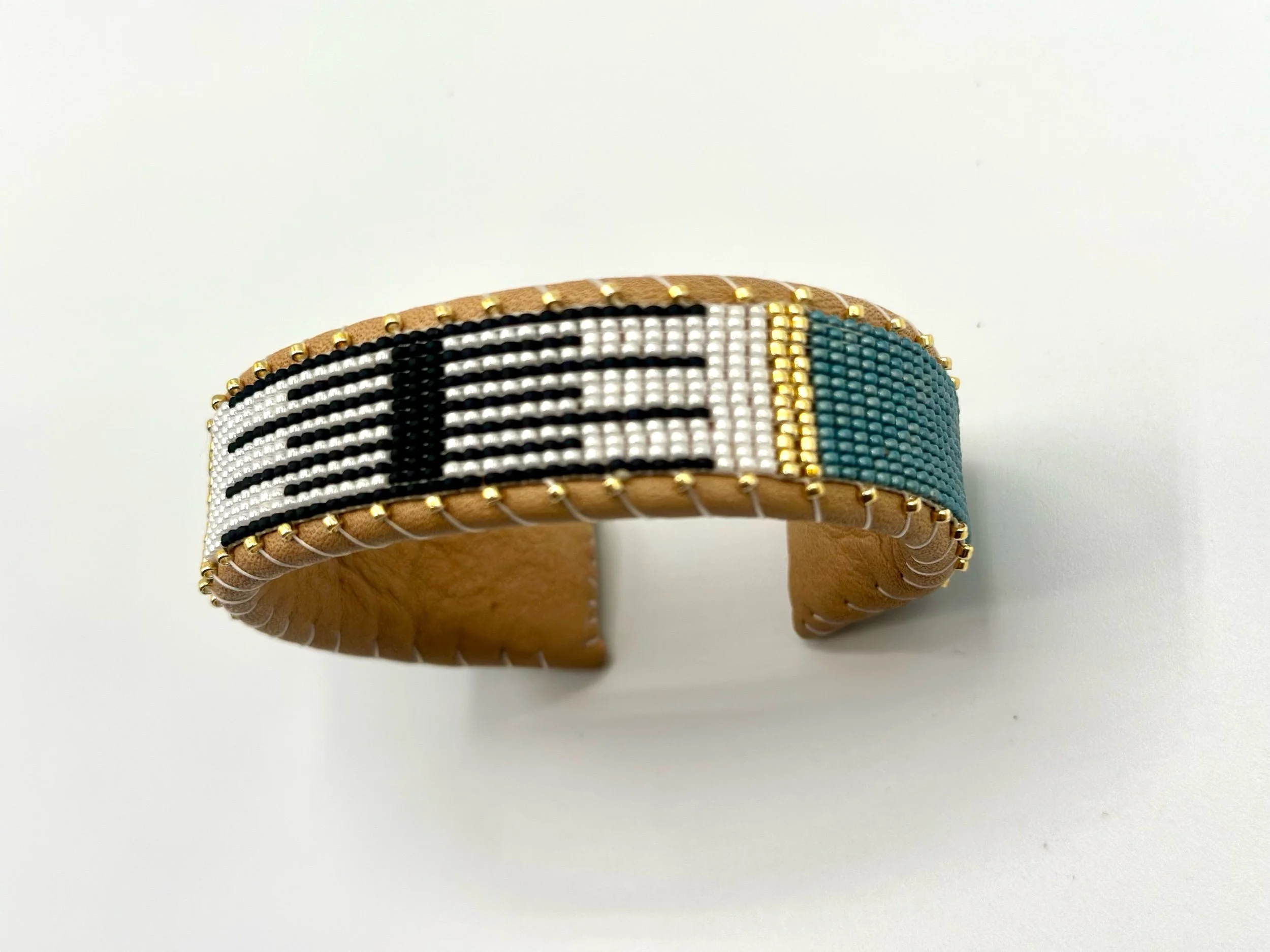 Leather cuffs are Hand-Crafted from high-quality glass and metal beads, stitched onto genuine leather, with a solid copper inlay that provides structure and adjustability. Available in very limited quantities.